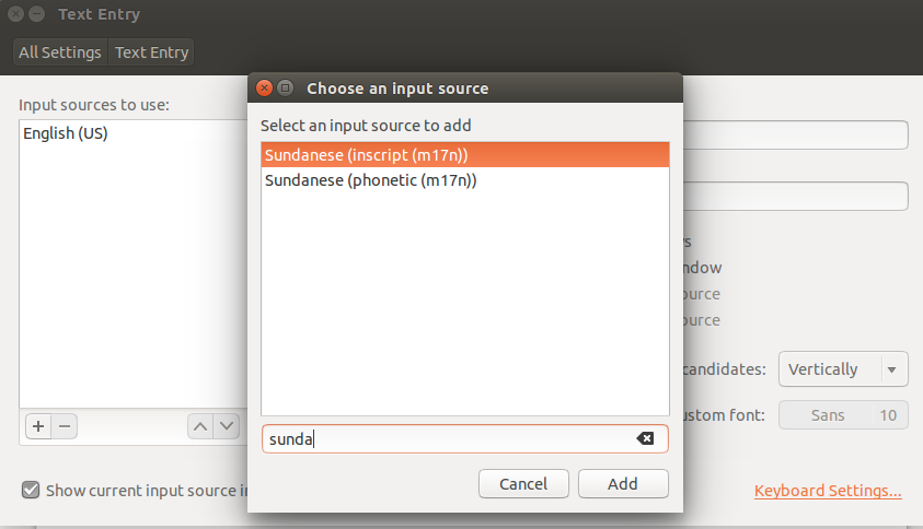 Selanjutnya, cari source dengan kata kunci "sunda". Pilih source Sundanese (incript m17n) yang telah terdaftar