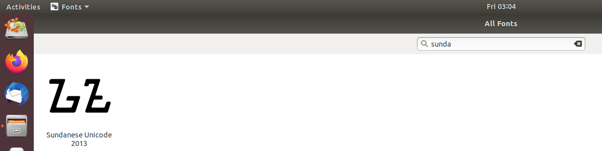 Cek instalasi font aksara sunda, dari menu dash pencarian ketik "font viewer" untuk melihat font yang sudah ter-instal